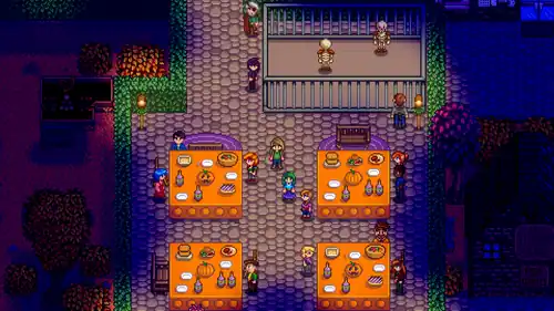 The festival features a maze where it is possible to obtain the Golden Pumpkin on odd years and a Prize Ticket on even years. Pierre has a shopping booth where the player can purchase festive items including a Rarecrow, Jack-O-Lantern, the Jack-O-Lantern recipe, and other items.