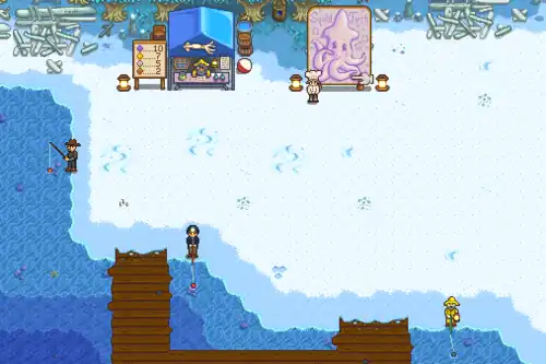 At the festival there are ice sculptures and igloos set up as well as a small shop selling festive decorations. There's also an Ice Fishing Contest the player can take part in along with Pam, Willy, and Elliott. The player wins if they catch at least five fish. Players are automatically provided with a fishing rod for the duration of the competition. The first win earns the player two tackles, 1 Magnet bait, and a Sailor's Cap. Subsequent years earn the player a Prize Ticket.
