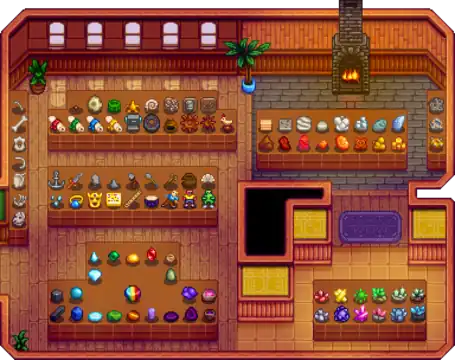 Merchants | Abandoned House • Adventurer's Guild • Blacksmith • Bookseller • Carpenter's Shop • Casino • Desert Trader • Fish Shop • Giant Stump • Harvey's Clinic • Ice Cream Stand • Island Trader • JojaMart • Marnie's Ranch • Oasis • Pierre's General Store • Qi's Walnut Room • The Stardrop Saloon • Traveling Cart • Volcano Dwarf • Wizard's Tower | |
