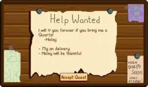 Every day (except the first day of the game) the bulletin board outside Pierre's General Store may have a randomly generated Help Wanted quest that can be completed in exchange for money and sometimes increased friendship with the quest giver. When a new quest is available, the bulletin board will have a yellow exclamation point floating above it. Rewarded money depends on the number of items/monsters involved, the player's skills, and sometimes a bit of randomness. Once the player has accepted a Help Wanted quest they will have 2 days to complete it, the current day and the next.