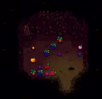 - ↑ 1.0 1.1 Fruit spawning is controlled in the game code by FarmCave::DayUpdate. The code loops repeatedly, with a 34% chance of the loop terminating on each iteration. Otherwise, the spawn location is randomly selected from one of 90 tiles. Fruit only spawns if the selected tile is a valid location. 40 of the tiles are never valid (in the cave walls); existing fruit, equipment, or flooring in the cave will also make tiles invalid.