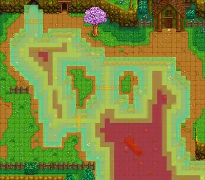 - The Glittering Boulder blocking the water flow west of the mine entrance can be removed (by completing all Fish Tank Bundles or purchasing "Panning" from the Joja Community Development Form for