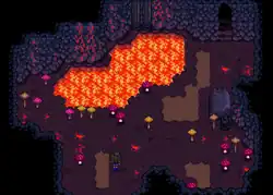 Some floors have islands surrounded by lava. Occasionally pressure pads, treasure chests, or useful mining nodes will spawn on the islands. To reach them, use the watering can to pour water on the lava and create a bridge. Fishing inside the dungeon is not possible.