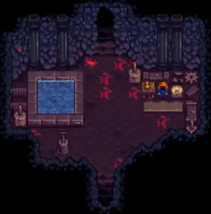 On floor 5 of the dungeon, there is a dwarf that runs a small shop and a pool where the Player can refill their Watering Can. 3 crates are always present on this floor. Monsters cannot spawn here, but a Dwarvish Sentry can still spawn when a crate is broken. The crate closest to the dwarf has a different drop pool than the rest of the crates, including an 80% chance of containing a gold quality Magma Cap.[4]