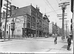 Constructed in the Neo-Renaissance style, the structure was built in 1879, and transformed into a hotel in 1890.[5] In 1891, it housed the Gaiety Museum and Theatorium, a popular Victorian-era curios showcase. In May 1896, it started housing the Palace Theatre, and on June 27 showed the first movies in North America, making it the first cinema in North America.[6] The cinema system used a projector system developed by the Lumiere brothers, the cinématographe, and had a screen the size of a towel. The first films shown were of a train, a ship, a cavalry charge, and demolishing a wall.[7] The show continued for two months, and were presented by Louis Minier and his assistant Louis Pupier.[8] In September 1896, continuous showings with the cinematographe lumiere started.