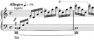 The main technical difficulty of this piece is playing the uninterrupted right hand arpeggios, including the swift position changes, in legato powerfully and accurately at the suggested tempo ( = 176) without straining the hand. The momentum of the motion has to be transferred by the outer hand and the fifth finger to the accentuated top notes. French pianist Alfred Cortot (1877–1962) states that the first difficulty to overcome is "stretch and firmness in shifting the hand over nearly the whole length of the keyboard."[13] Exercises introduced by Cortot, Gottfried Galston[14] and Alfredo Casella[15] deal mostly with stretch and anticipation of position changes. Ferruccio Busoni in his Klavierübung introduces an exercise for two hands in contrary motion, somewhat reminiscent of Leopold Godowsky.[16] Australian pianist Alan Kogosowski warns against straining the right hand by constant overstretching. To avoid strain, the first note of the position "must be released like a hot potato," and the hand "should move quickly and laterally, without stretching, from the first note to the next note and the next position."[17]