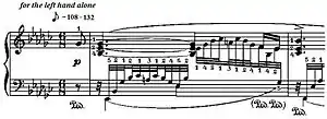 A version for the left hand alone can be found in Leopold Godowsky's 53 Studies on Chopin's Études.[23] Canadian pianist Marc-André Hamelin (born 1961) describes this "most beautiful achievement" thus: "A continuous, rapid line of demisemiquavers snakes its way around and through Chopin's melancholic chorale, enhancing it without being in the least bit obtrusive."[24]