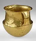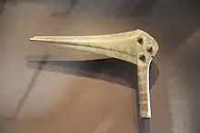 A gold axe and jewellery dating from c. 1800 BC were discovered at Dieskau in Germany and are thought to be associated with the ruler buried in the Bornhöck mound.[41] A gold dagger dating from the Early Bronze Age has also been recovered from Inowrocław in Poland, associated with the Iwno culture.[42][41] Gold weapons are known from other parts of Europe in this period, including a gold axe from Tufalau in Romania belonging to the Wietenberg culture,[43] a gold dagger from Mala Gruda in Montenegro belonging to the Cetina culture,[44] and gold daggers and halberds from Perșinari and Măcin in Romania belonging to the Tei culture.[45] The Tei culture weapons were found buried with gold bracelets of Unetice type.[46]
