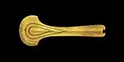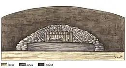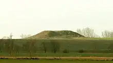 The size of the tombs varies, with the largest of all originally being the Bornhöck burial mound (the largest Bronze Age burial mound in central Europe), dating from c. 1800 BC. The mound belonged to a ruler or 'prince' who was likely associated with the Nebra sky disc.[35] It was originally around 65 metres in diameter and 15 metres in height, but was mostly destroyed in the late 19th century.[36] The mound was originally covered with white limestone (chalk) – a very unusual practice in central Europe but common in contemporary Bronze Age Britain.[37][38][lower-alpha 1] A 'brotlaibidol' clay tablet was also found in the grave.[39]