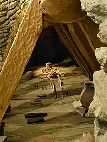 In the classic phase (approximately 1850–1750 BC), the Úněticean burial rite displays strong uniformity, regardless of the gender or age of the deceased. Men and women were buried in the same north–south position. The grave goods consisted of ceramic vessels (usually 1–5), bronze items (jewellery and private belongings, rings, hair clips, pins etc.), bone artefacts (amulets and tools, including needles), occasionally flint tools (the burial of Archer from Nowa Wieś Wrocławska, for example, was buried with colour flint arrowheads).[49] A body deposited within a grave might have been protected with mats made from plant materials or a coffin, but in the majority of cases there was no additional coverage of the corpse. A well-known example of wicker-made coffin inhumation derives from Bruszczewo fortified settlement, nearby Poznań in Greater Poland.[50] In approximately 20% of burials, stone settings were found. Erection of a full stone setting or just a partial one (a few stones in the corners of grave) seems to be quite a common practice observed in all phases of the EBA in Central Europe. Wooden coffins were discovered at several sites such as in Lower Silesia. Únětice culture coffin burials can be divided in two types, according their construction: coffins of the stretcher type, and coffins of the canoe type. Coffins were made of single block of wood. The most prominent example of a rich cemetery containing many of such inhumations is in Przecławice[51] nearby Wrocław. Coffin burials appear in Central Europe in the Neolithic and are well known from Bell Beaker and Corded Ware cultures in Moravia.[52]