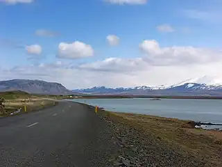 Þjórsárdalur (Icelandic pronunciation: [ˈθjour̥sˌaurˌtaːlʏr̥] ) is a ⓘvalley in Árnessýsla county in Iceland that lies between mount Búrfell alongside the river Þjórsá to the east and mount Skriðufell to the west. The valley is quite flattened over and pumicey after repeated eruption of the nearby volcano Hekla as well as other volcanoes in the vicinity like the Vatnaöldur volcanic system which produced Iceland's biggest known lavafield Þjórsá Lava (Þjórsárhraun) in prehistoric times or the Grímsnes volcanic system with the crater Kerið. Landmarks in Þjórsárdal include Þjóðveldisbærinn Stöng, Gjáin, Háifoss, and Vegghamrar.