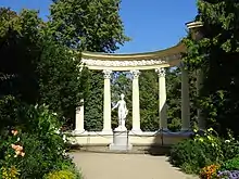 The southern corridor, which is accessed from the Ballroom, features the most sophisticated painted ornaments. The Duchess had the walls and ceiling decorated with illusionist design, which transformed the interior into a gazebo located amongst ruins, overgrown with grapevine and hollyhocks. The scenery of the corridor was used by the Duchess as a background for a gallery displaying her collection of sculptures, both antique and 18th-century replicas. A similar function has the Columned Salon, located to the east of the Sculpture Gallery. Inside, among two rows of ionic columns, imitating a placement of a pagan god, only one sculpture is displayed. It is a portrait sculpture depicting Henryk, the beloved pupil of Duchess Lubomirska, presented as the ancient god Eros by Antonio Canova.
