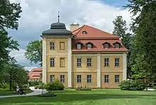 The early Baroque manor house was built around the second half of the 17th century.[1] The main body and two corner alcoves[1] date back to this period. In the 1820s, during a reconstruction, changes were made to the appearance of the façade and the interior.[1] The reconstruction project is attributed to Martin Franz of Reval.[1] The most significant changes in the appearance of the building were made in the years 1838-1844 by Albert Tollberg. Changes were made to the layout of rooms, a representative staircase was erected, new storeys were built and window openings were enlarged.[1] After World War II, the palace was taken over by the Polish state. A school was located in the palace until 1977.[1] Since the end of the 1970s, it has been abandoned and fell into ruin. In 1992, the palace was bought by a Polish-German partnership, which began renovation works.[1]