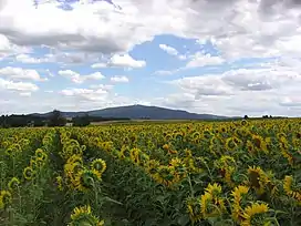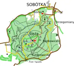 The Ślęża (Polish: [ˈɕlɛ̃ʐa]; German: Zobten or Zobtenberg, later also Siling) is a 718 m (2,356 ft) high mountain in the Sudeten Foreland in Poland. The mountain is built mostly of granite and is covered with forests.