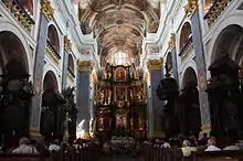 The monumental altar was made between 1712 and 1714 by the finest sculptors present in Poland at the time. The object, composed of three main parts or storeys, is adorned by the gilded figures of saints and martyrs. John III Sobieski gifted a painting to the Jesuits after his victory at the Battle of Vienna and it was later incorporated into the altarpiece.[12]