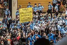 Amidst heavy police presence in Causeway Bay aimed at stopping demonstrations along the traditional march route in Hong Kong, a 50-year-old man stabbed a police officer in the back with a knife at 10 pm, and then turned the knife on himself. The police officer was rushed to hospital in a critical condition but survived, while the alleged assailant was declared dead upon arrival at the hospital.[28][29] Hong Kong's newly appointed Security Secretary, Chris Tang, declared it a "terrorist act" committed by a "lone wolf", but blamed "many people who have encouraged violence and incited hatred toward society and the country".[28] After mourners started laying flowers at the location where the suspect fell, police warned against mourning, amounting it to "supporting terrorism".[30]