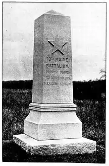 A fraction of the regiment consisted of three-year enlistees, who formed the three-company 10th Maine Infantry Battalion (Cos. A, B, and D) upon the discharge of the two-year enlistees on April 26, 1863.[3] The 10th Maine Battalion served as headquarters guard for the XII Corps at the Battle of Chancellorsville and as part of the Army of the Potomac's provost guard at the Battle of Gettysburg.