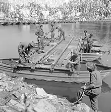 Sappers repair the pontoon bridge at Vernon, damaged by German mortar fire