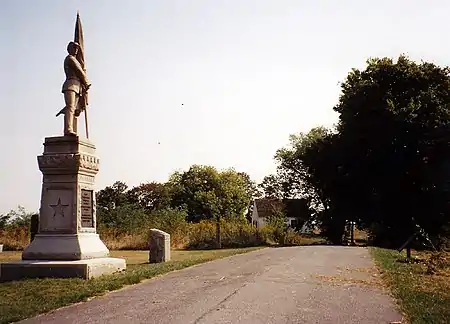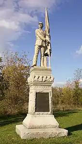 The 125th Pennsylvania Volunteer Infantry Monument on the Antietam Battlefield was dedicated on September 17, 1904, and is located on Confederate Avenue behind (West) of the Dunker Church.[27] During the 125th Pennsylvania's withdrawal from the indicated position in the West Woods, one of the most dramatic events in the regiment's history began with the regimental color-bearer, Sergeant George Simpson who stands immortalized in granite on top of the monument: