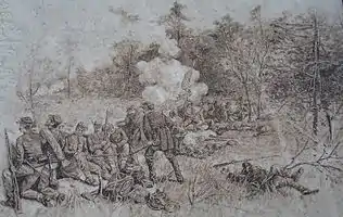 The 125th Pennsylvania Infantry volunteered during the American Civil War and served a 9-month term from August 1862 to May 1863.[1] It selected the motto In God We Trust.[2] The Regiment fought at the Battle of Antietam[1][3] under the leadership of Colonel Jacob C. Higgins[4] less than six weeks after being recruited in Blair, Cambria and Huntingdon Counties. The Regiment was noted for its charge through the East Woods, along the Great Cornfield, down Smoketown Road, past the Dunker Church, and into the West Woods.[5] While in formation beyond the Dunker Church in an 'overextended' position, the Regiment repulsed four counterattacks at a price of 229 casualties (33% of engaged) within 20 minutes.[6] A fifth, heavily reinforced Confederate counterattack forced a retreat with a desperate struggle to retain the Regimental colors. Two weeks before the end of their enlistment, the 125th Pennsylvania also occupied the perimeter of Chancellorsville, Virginia, during the Battle of Chancellorsville.[4][3]