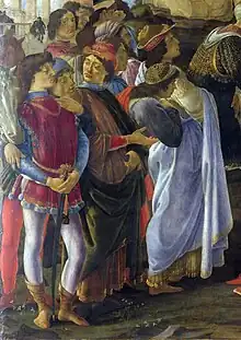 The general European convention of completely covering married women's hair was not accepted in warmer Italy.[16] Italian women wore their hair very long, wound with ribbons or braided, and twisted up into knots of various shapes with the ends hanging free. The hair was then covered with sheer veils or small caps. Toward the 1480s women wore chin-length sections of hair in loose waves or ripples over the ears (a style that would inspire "vintage" hair fashions in the 1620s and '30s and again in the 1840s and 1850s). Blonde hair was considered desirable (by Botticelli for one), and visitors to Venice reported that ladies sat out in the sun on their terraces with their hair spread out around large circular disks worn like hats, attempting to bleach it in the sun. Chemical methods were also used.[25]