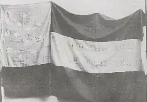One of these "1st National" pattern flags was given to the Joe Wright Guards, which became Company H, 4th Regiment, Arkansas State Troops. The flag was made by Ms. Josephine Wright and Ms. Jane Bailey.[12] The flag is 36" by 72" and has the words GO AND THE LORD BE WITH THEE" painted on the white stripe. The flag was allegedly chosen for the colors of the 4th Regiment. After the 4th Regiment was disbanded, many of the former members of the Joe Wright Guards joined Company D, of the new 16th Arkansas Infantry Regiment, and according to the Memoirs of Captain J. B. Bailey,[13] the flag was chosen as the regimental colors of the 16th. The flag was carried by the 16th Arkansas during the Battle of Iuka and the Battle of Hatchie's Bridge during the Iuka-Corinth Campaign. The flag was retired when the 16th Arkansas was issued a new Van Dorn Pattern Battle Flag. The 16th Arkansas was captured during the Siege of Port Hudson, but the old set of colors was smuggled out and returned to the family of Ms. Wright. The flag remained in the family until 1981, when it was donated to the Atlanta Civil War Museum, but the current location of the flag is unknown.[14]