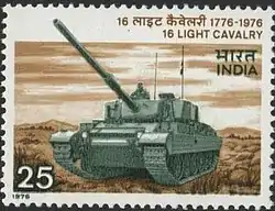 The 16th Light Cavalry is a regiment of the Armoured Corps, a primary combat arm of the Indian Army. Prior to India gaining independence from the British in 1947, it was a regular cavalry regiment of the British Indian Army. It was formed in 1776 and is the oldest armoured regiment raised in India.[1] The 16th Light Cavalry saw service in a number of conflicts ranging from the Second Anglo-Mysore War in 1781 to World War II. It has a number of battle honours including "Punjab 1965" earned during the Indo-Pakistani War of 1965.