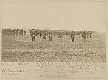During the night, the men of the 17th heard the cries and moans of the wounded lying in the valley by the RF&P tracks between the two armies.[42] On Sunday, a truce went into effect to recover the wounded and bury the dead. On Sunday night, the Rebel skirmishers trying to find the U.S. Army's position were driven off before midnight, and through the night and early morning, the men of the regiment could hear the Confederates repairing and strengthening their lines.[43]