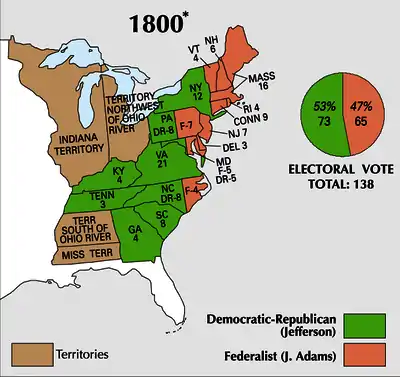 The 1800 United States presidential election was the fourth quadrennial presidential election. It was held from October 31 to December 3, 1800. In what is sometimes called the "Revolution of 1800",[2][3] the Democratic-Republican Party candidate, Vice President Thomas Jefferson, defeated the Federalist Party candidate, incumbent president John Adams. The election was a political realignment that ushered in a generation of Democratic-Republican leadership. This was the first presidential election in American history to be a rematch.