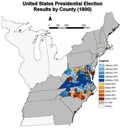 Results by county explicitly indicating the percentage of the winning candidate in each county. Shades of blue are for Jefferson (Democratic-Republican) and shades of yellow are for Adams (Federalist).