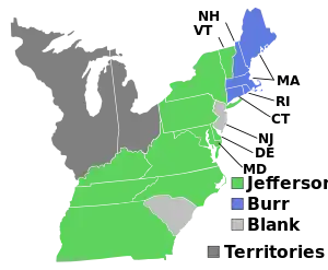 1801 Contingent Election Results. Green denotes states voting for Jefferson and blue denotes states voting for Burr. States in grey cast blank ballots.