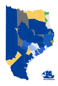 - ↑ According to the results from the Texas State Archives, an unknown man with the surname "Green" won Red River county by 1 vote, it is speculated that this is someone by the name of Silas J. Green based on the handwriting, but this can not be conclusively proven.