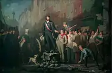 ![]() Louis-Napoléon Bonaparte (right), with the bust of Napoleon I behind him, delivers instructions to his conspirators in the night of 1 to 2 December. Depicted, from left to right: Mocquard, Saint-Arnaud, Morny and Fialin. Drawing by Philippoteaux, engraved by E. Leguay and published in 1853 | |