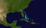 A tropical storm was first seen in the eastern Caribbean Sea near Martinique on September 26. The storm moved west-northwestward and likely intensified into a hurricane by the following day. It then moved northwestward, hitting Haiti's Tiburon Peninsula just west of Jacmel on September 28 with winds of 115 mph (185 km/h). Briefly re-emerging into the Caribbean, the storm struck Cuba near Guantánamo Bay early the next day, possibly at a weaker intensity. The system then turned westward over southern Oriente Province and soon weakened to a tropical storm, before again re-entering the Caribbean early on September 30. By October 3, the cyclone re-strengthened into a hurricane over the northwest Caribbean. After curving northward a few days later, the system passed just offshore the Yucatán Peninsula as it entered the Gulf of Mexico on October 5. Thereafter, the hurricane accelerated northeastward and re-intensified to reach sustained winds of 115 mph (185 km/h) prior to making landfall near Punta Rassa, Florida, early on October 7. The system emerged into the Atlantic several hours later and continued northeastward until October 9, when it became an extratropical cyclone, which dissipated on the following day.[5]