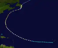 The official track for this storm begins just south of the Cape Verde islands on August 13,[5] several hours before being encountered by the bark Crest of the Wave.[2] Following the track of a Cape Verde hurricane, the cyclone became hurricane on August 17. It recurved north-northwestward on August 21 and then north-northeastward by the next day. On August 23, the storm peaked with winds of 115 mph (185 km/h), equivalent to a minimal Category 3 hurricane on the Saffir–Simpson scale. As it passed to the south of Nova Scotia, the storm turned northeastward, moving near Sable Island early on August 25.[5] The Atlantic hurricane reanalysis project estimated in 2011 that the cyclone attained a barometric pressure of 962 mbar (28.4 inHg) around this time,[6] although the storm had likely weakened to a Category 2 hurricane. By late on August 25, the system turned northward and decelerated, striking the Cape Shore region of Newfoundland's Avalon Peninsula on the following day. Thereafter, the storm became extratropical on August 27 over eastern Newfoundland or just offshore. The extratropical remnants moved northeastward and dissipated over the Labrador Sea late on August 28.[5]