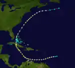On August 15 a hurricane was seen 90 miles northeast of Barbados. On August 16 it passed over the island of Saint Vincent as Category 2 hurricane. The hurricane passed north of Grenada and continued westward towards the coast of Venezuela, bringing a heavy gale, and some damage, o Curaçao before curving north. Around midnight on August 19 it hit Jamaica, still at Category 2 intensity. The island experienced winds of 110 mph (180 km/h) throughout August 19 and 20th. The hurricane approached the south coast of Cuba as a major Category 3 hurricane on August 21. It crossed Cuba over the central province of Ciego de Ávila before exiting the island near Moron on the north coast. The hurricane then passed over Nassau on the night of August 22. It quickly moved northeastward, and travelled parallel to the east coast of the United States, still at Category 2 intensity, before it weakened and dissipated south of Newfoundland on the August 27.[3] Damage was extensive at several of the locations impacted by the hurricane and some fatalities occurred on St. Vincent, Jamaica and possibly Cuba. Throughout the south of St Vincent, damage was extensive with many injuries and some fatalities reported. Thousands of trees were blown down and 300 homes destroyed on the island. At Jamaica crops and plantations were destroyed and some ships wrecked in Kingston harbour. In Cuba hundreds of homes were blown down, many trees were uprooted and some areas flooded. In the Bahamas, several sailing ships were blown ashore, both at Nassau and at Andros and at the Berry Islands.[3]