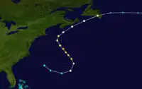 A tropical storm formed west of Bermuda on August 20. It passed about 175 miles to the south of the island before turning northwestward. As the storm travelled north on August 21, it intensified to a 115 mph (185 km/h) Category 3 hurricane. It reached the area of Georges Bank at that intensity on August 22 and damaged several vessels there.[3] On August 23 it weakened to a Category 1 hurricane and became an extratropical storm on August 24 near the Grand Banks.