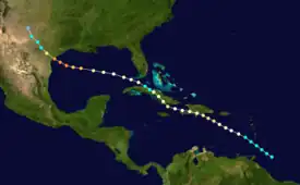 Little more than a day after the dissipation of the previous hurricane, a broad area of low pressure over the western Caribbean Sea developed into a tropical storm while centered about 180 miles (290 km) east-southeast of Punta Allen, Quintana Roo, Mexico.[4][12] Over the next two days, the storm meandered toward and through the Yucatán Channel, gradually intensifying as it proceeded to the north-northwest and north. Late on June 18, the system attained hurricane status off the western tip of Pinar del Río Province, Cuba. The following day, the cyclone turned to the north-northeast, producing "severe gales" (47–54 mph, 76–87 km/h) over the waters off Cuba and Jamaica, as reported by ships.[14] At 00:00 UTC on June 20, the storm reached its peak intensity of 100 mph (160 km/h), and shortly afterward its forward speed accelerated. At 11:00 UTC on June 21, the cyclone made landfall a short distance east of St. Marks, Florida, as a Category 2 hurricane.[4] The storm gradually decreased in intensity over the next day and a half as it crossed the Southeastern and Mid-Atlantic states. By 18:00 UTC on June 23, the system passed about 70 miles (110 km) southeast of New York City and curved to the east before dissipating a day later.[4]
