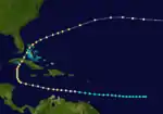 The official track for this begins about 1,000 mi (1,610 km) east of Barbados on October 12. Moving westward to west-northwestward, the system passed through the Windward Islands three days later. After entering the Caribbean, the storm intensified into a hurricane on October 16 and to Category 2 hurricane about 24 hours later, peaking with winds of 105 mph (165 km/h). The hurricane turned northward on October 19, passing just west of the Cayman Islands on the next day. Thereafter, the cyclone curved north-northeastward and made landfall in Cuba near the city of Cienfuegos around 18:00 UTC on October 21. Quickly emerging into the southwestern Atlantic early the next day, the storm struck Grand Bahama island in the Bahamas shortly after 12:00 UTC. A more northeasterly motion then commenced and the hurricane crossed over or near Bermuda on October 24. The system likely began weakening significantly on the following day and transitioned into an extratropical cyclone about 700 mi (1,125 km) southwest of Flores Island in the Azores on October 26. The extratropical remnants dissipated several hours thereafter.[2]