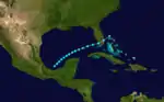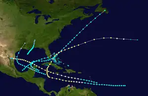 Meteorologist Ivan Ray Tannehill began the track for this storm in the northwest Caribbean on September 28, which subsequent meteorologists such as José Fernández Partagás confirmed in 1995.[1] The system moved west-northwestward and made landfall in the Yucatán Peninsula south of Tulum.[2] Due to trekking across the peninsula for several hours, the cyclone likely weakened to a tropical depression, but re-intensified into a tropical storm upon emerging into the Gulf of Mexico on September 29. Thereafter, the storm peaked with winds of 60 mph (95 km/h) as it curved northeastward and then almost due eastward by the following day. However, upon reaching the Straits of Florida late on October 1, the cyclone assumed a east-northeastward to northeastward motion while passing just south of the Florida Keys. By October 3, the storm moved northeastward towards the western Bahamas, crossing the Abaco Islands before reaching the open Atlantic. The cyclone moved ashore Newfoundland near the Burin Peninsula on October 7 and was last noted shortly thereafter.[2]