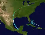In June, a low-pressure area was observed over the western Caribbean.[2] At 12:00 UTC on June 12, a tropical depression developed about 20 mi (30 km) north of Swan Island, Honduras. The depression moved north-northeastward and intensified into a tropical storm early the next day. Later on June 13, the storm made landfall in modern-day Artemisa Province of Cuba with winds of 45 mph (70 km/h). After reaching the Gulf of Mexico late on June 13, the system continued to strengthen and peaked with maximum sustained winds of 60 mph (95 km/h). Around 23:00 UTC, it made landfall near Steinhatchee, Florida, at the same intensity.[3]