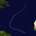 A tropical storm was first observed at 06:00 UTC on September 16, while located about 640 mi (1,030 km) southwest of Cape Verde, at the most southerly latitude of any North Atlantic tropical-storm-strength cyclone on record.[6] The storm headed west-northwestward for a few days and slowly strengthened. Late on September 19, it accelerated and began curving northwestward. At 00:00 UTC the next day, the storm strengthened into a Category 1 hurricane on the modern-day Saffir–Simpson hurricane wind scale. Later on September 20, the hurricane curved northward and then to the northeast. Further deepening occurred, with the storm becoming a Category 2 hurricane early the following day.[3]