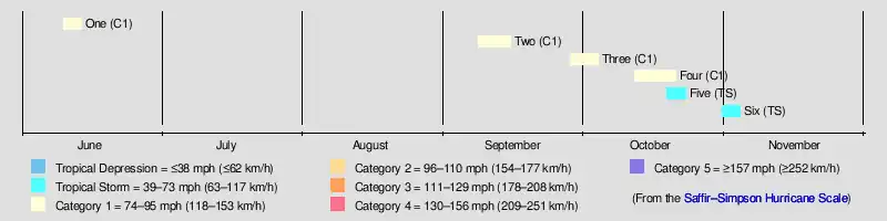 - ↑ Chronological List of All Hurricanes: 1851 – 2015. Atlantic Oceanographic and Meteorological Laboratory (Report). National Oceanic and Atmospheric Administration. 2016. Retrieved June 27, 2016.