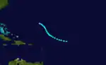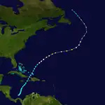 On October 1, a tropical depression developed in the southwestern Caribbean Sea. Moving slowly north-northeastward, it reached tropical storm status early on October 3. The following day, the storm curved northeastward.[2] Kingston, Jamaica, recorded rainfall as the system bypassed the island.[4] Late on October 5 and early on October 6, the storm passed through the Windward Passage.[2] Eastern Cuba was affected "with some force", but damage was not significant.[4] Entering the Atlantic Ocean,[2] the system passed through the southeastern Bahamas and Turks and Caicos Islands without causing damage.[4] While centered about halfway between Bermuda and Turks and Caicos Islands, the storm strengthened into a Category 1 hurricane on the Saffir–Simpson hurricane wind scale.[2]