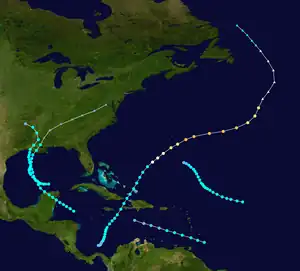 Of the season's five tropical cyclones, only one reached hurricane status, the fewest since 1890. Furthermore, that storm strengthened into a major hurricane, which is Category 3 or higher on the modern-day Saffir–Simpson hurricane wind scale.[1] This storm, which was the fourth and strongest hurricane of the season, peaked at Category 3 strength with 120 mph (195 km/h) winds. It was also attributed to at least six fatalities after sending a rogue wave across the steerage of the steamer Campania. The first storm also resulted in two deaths after a schooner wrecked in Barbados.