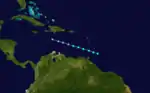 The first storm of the season, already at tropical storm intensity, was identified on September 6 to the east of Grenada.[2] A small storm, it quickly passed through the southern Lesser Antilles early on September 7.[3] The next day, the storm weakened to a tropical depression before dissipating as a shallow but large system.[2][3] A schooner sailing from Bridgetown to Suriname encountered heavy seas just a day out of port and turned back. It was thrown onto the pierhead and wrecked. The captain and a crewman were swept overboard and drowned.[3]
