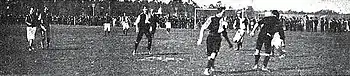 Nevertheless, referee Jordan awarded Rosario a penalty after Mazzulo touched the ball with his hand. Wells scored to tie the match, 3–3. That was the final result on 90 minutes so an extra time was played to determine the champion. On overtime, CURCC scored another goal that was annulled by the referee alleging foul to defender Knight. After that play, Stocks ran carrying the ball and after dribbling some adversaries, shot it to CURCC's goal. The ball hit the underside of the crossbar, bouncing down toward the line and was throwed out by Carbone. Referee Jordan conceded the goal to Rosario, causing CURCC players to leave the field in disagreement with his decision.[3] Meanwhile, CURCC supporters jumpered into the field so the match was suspended with Rosario winning 4–3.[2]