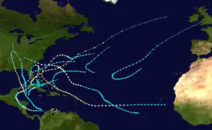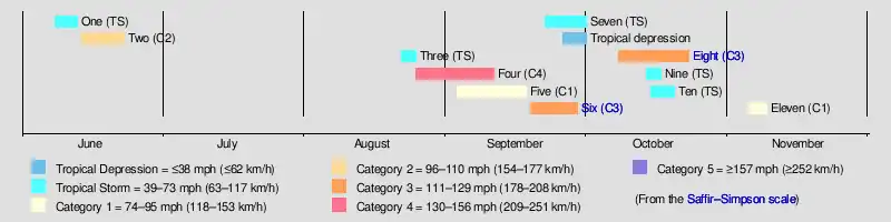 The season's activity was reflected with an accumulated cyclone energy (ACE) rating of 163, the highest total since 1893. ACE is a metric used to express the energy used by a tropical cyclone during its lifetime. Therefore, a storm with a longer duration will have high values of ACE. It is only calculated at six-hour increments in which specific tropical and subtropical systems are either at or above sustained wind speeds of 39 mph (63 km/h), which is the threshold for tropical storm intensity. Thus, tropical depressions are not included here.[4]