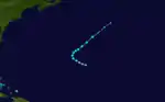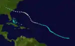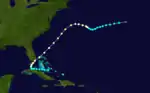 The hurricane slowly intensified as it traveled offshore, continuing to strengthen throughout the day on June 17, eventually reaching Category 2 status by June 18. As the storm headed northeastward, the hurricane began to weaken, becoming a tropical storm by June 21. The system turned toward the east-southeast on June 21, later recurving towards the east-northeast on June 22. It weakened to a tropical depression by June 23, transitioning into an extratropical cyclone later that day.[2] Impacts caused by the hurricane were minimal—a boat was partially dismantled at Key West, and a wharf at Coconut Grove was also damaged. In addition, the schooner Hidie Feroe sank, although her crew was later rescued.[5]
