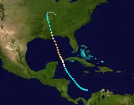 The sixth hurricane of the season originated as a tropical depression on September 19 in the southwestern Caribbean Sea. The following day, the depression intensified into a tropical storm. It continued to intensify steadily, eventually reaching hurricane status on September 24 as it exited the Yucatán Channel. The hurricane continued to intensify as it moved north-northwest and attained Category 2 intensity in the Gulf of Mexico. During the afternoon, the storm intensified further into a major hurricane.[2] At this time, the hurricane was 300 miles (485 km) west-northwest of Cuba.[5] The hurricane maintained intensity and continued to drift north-northwest,[2] and weakened to a Category 2 hurricane as it made landfall near Pascagoula, Mississippi, on September 27.[6] The hurricane weakened as it moved inland, quickly weakening to a tropical storm by September 28. The storm became extratropical on September 29.[2]